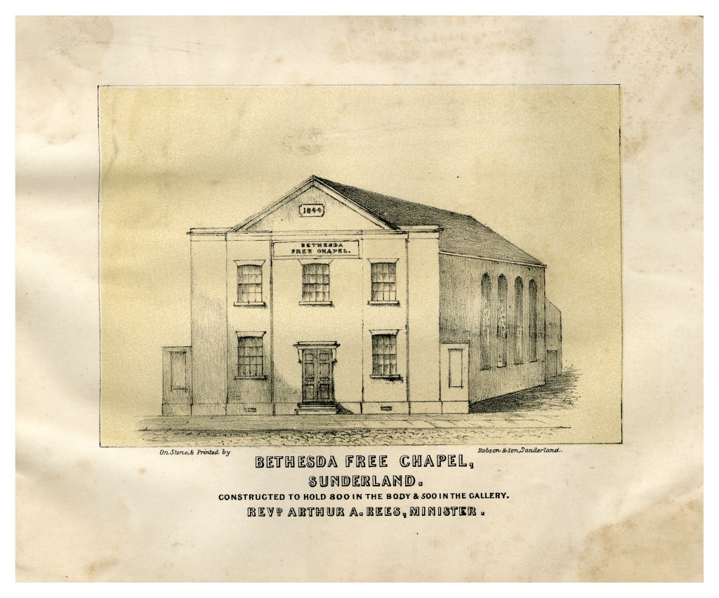 The Bethesda Free Chapel dates from 1844-5, with side galleries added in 1852. It was built for A.A. Rees and carries the date 1844 in the pediment. It is 2 stories high and was constructed in Garden wall bond brick and limestone rubble returns, with a rendered rear, ashlar sandstone plinth and painted ashlar dressings. The roof is of Welsh slate. Inside there is a font and a memorial to Arthur Augustus Rees, d.1884. LISTED GRADE 2