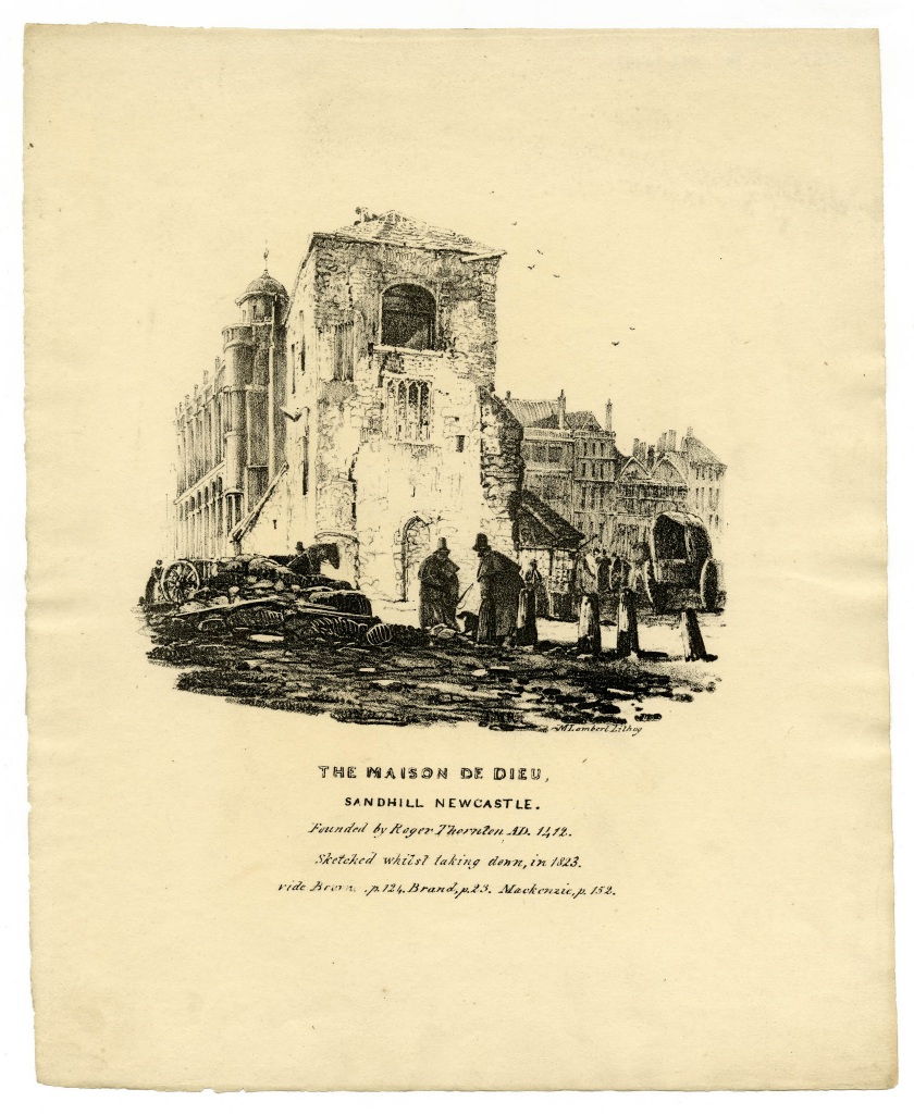 Merchant Roger Thornton endowed in 1425, on the death of his wife Agnes, the Hospital of St Catherine (the Maison Dieu - House of God), which he built at the east end of the medieval Guildhall (HER 4874). There was a master and three bretheren, free burgesses of Newcastle, who looked after nine poor men and four women who lived there. An endowment of 1425 names the master as John Fenwick (who also looked after St Lawrence chapel) and the first thirteen "paupers" as John Pynchebek, Robert Wermouth, William Cike, John Iriby, William Milton, Stephen Hunter, Thomas Bywell, John Fleming, John de Sayntannes, Isabella del Bothe, Lucy Smith, Margaret Fenwick, Katherind Finlay. Thornton later granted the use of the hall and kitchen of the hospital to the mayor and community of Newcastle. The Merchant Adventurers' Court was above the hospital, this being Newcastle's first Guildhall. The Mayor and Corporation were granted use of the hall and kitchen of St Catherines Hospital in 1456. The Merchants of Woollen Cloth/Drapers met here until 1512. In 1624 the Hospital was conveyed to the Mayor and burgesses by Sir Richard Lumley. The Maison Diew and Court were left untouched by Robert Trollopes reconstruction of the Guildhall in 1656. After some time in use as a warehouse the building was pulled down in 1823 and replaced with John Dobson's Greek Revival style Guildhall which still stands today.