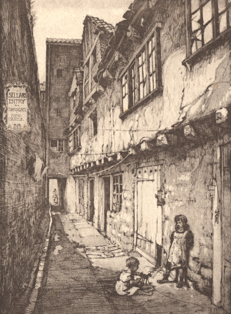 Behind the beer-houses, lodging houses and shops on Sandgate there were numerous alleys, chares or entries, described by Knowles and Boyle in 1890 as 'dark' and 'dingy'.. 'crowded with the miserable dwellings of the very poor'. The keelmen colonised the Sandgate area in the eighteenth century. Bourne recorded that several thousand people, mostly those who worked on the river, lived in Sandgate and the lanes off it. Sellar's Entry lay between Nos. 7 and 8 Sandgate and contained one of the oldest buildings in the neighbourhood. Building in Sellar’s Entry: