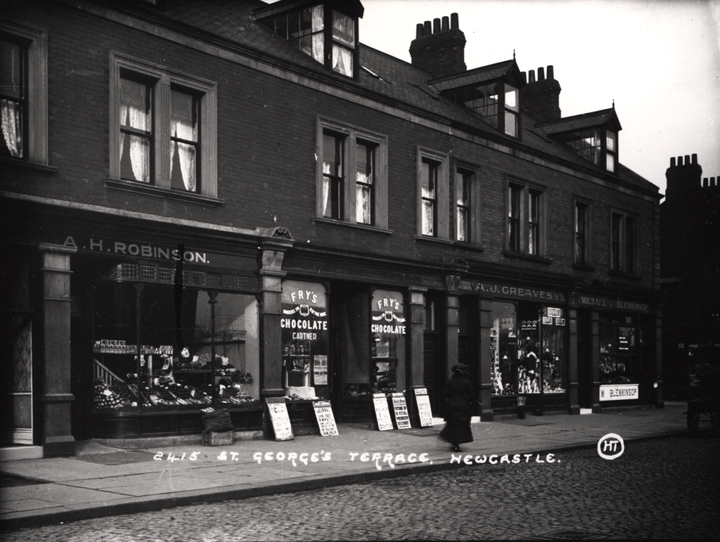 Combined shops and dwellings on the west side of St. George's Terrace between Thornleigh Road and Coniston Avenue. Completed in 1900. In 1910 the shops included a drapers, a creamery, ladies' outfitter, bakery, grocery and pharmacy. Today they are a coffee house, post office, estate agency, pharmacy and wine shop. The rest of the road was completed by 1906 with ten more shops, terraced houses and two churches.